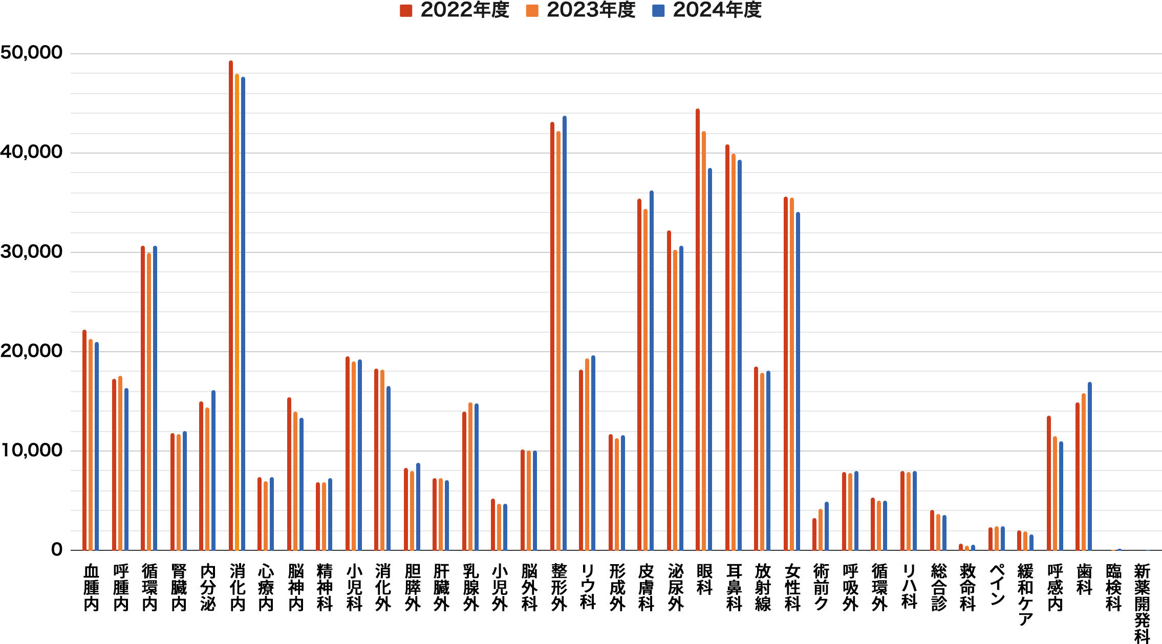 血液腫瘍内科 | 22,166 | 21,296 | 20,939 | 皮膚科 | 35,417 | 34,393 | 36,188 |