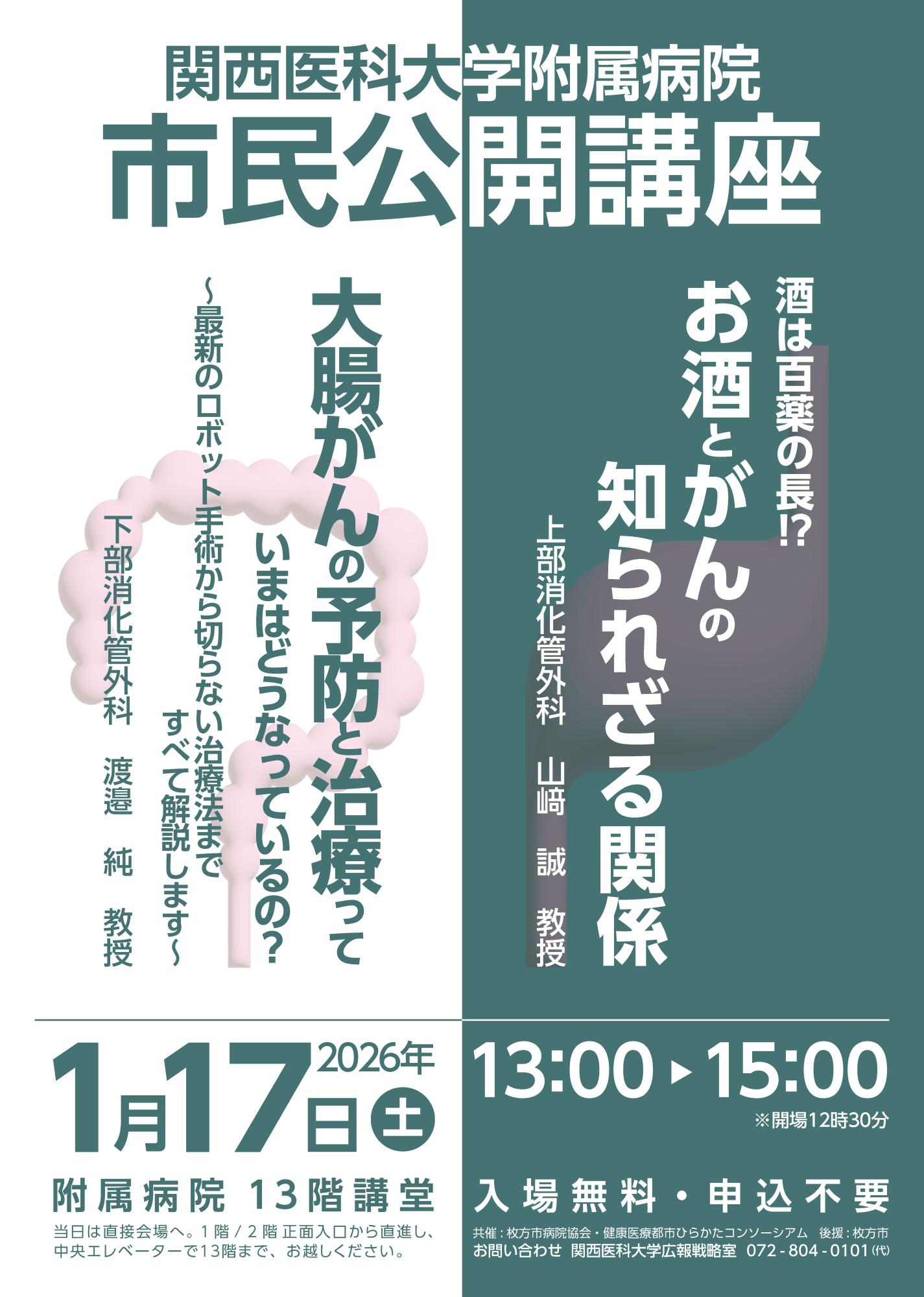 今回は、「酒は百薬の長!?お酒とがんの知られざる関係」と「大腸がんの予防と治療っていまはどうなっているの?〜最新のロボット手術から切らない治療法まですべて解説します〜」の2テーマで、専門医2名が講演します。