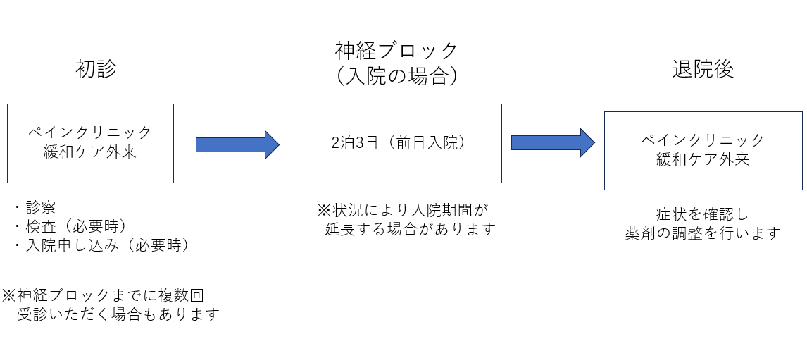 主治医またはかかりつけ医にご相談いただき、当院のペインクリニック・緩和ケア外来の予約を取ってください。その後ペインクリニック担当医、当院の緩和ケアチームと放射線科担当医が適応や方法を判断し、施行予定日を決定し、入院手続きを行います。